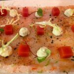 En primer lugar llegó el Carpacció de gamba roja, con lima, mayonesa de estragón y gelatina bloody mary. Muy buena presentación pero me esperaba más sabor a gamba (insuperable el Carpaccio de gamba por ahora del Restaurante El Rais de Menorca). Quizá el plato más flojo de todos los probados (el nivel es alto).